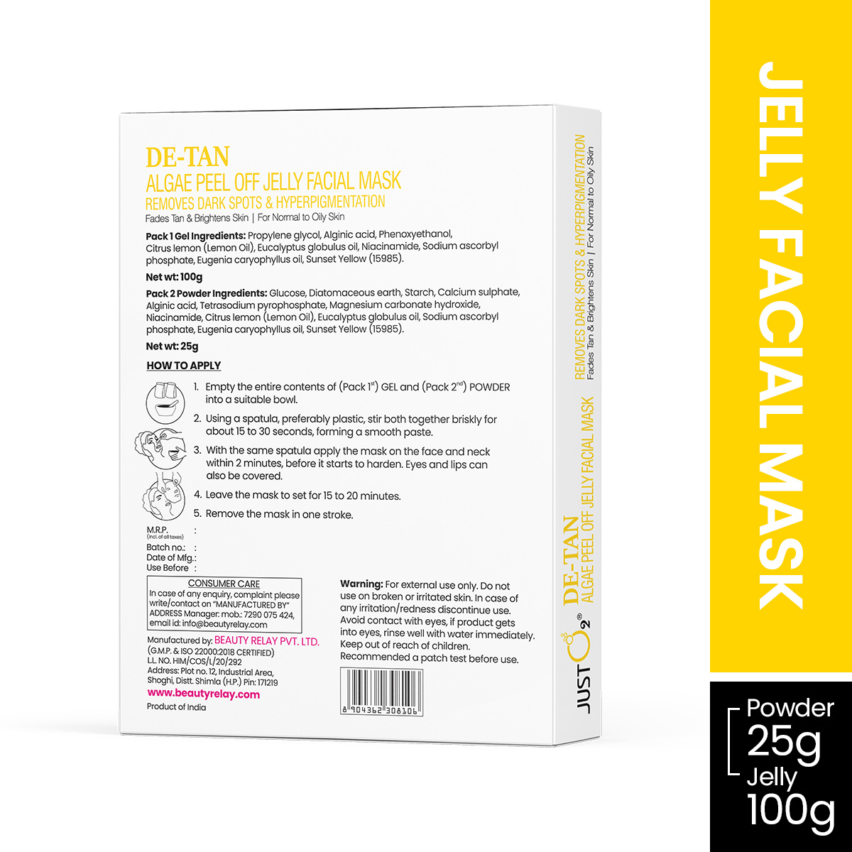 Say goodbye to tan and uneven skin tone with the Beauty Relay London De-Tan Algae Peel Off Jelly Facial Mask. Specially formulated with Citrus Lemon Oil, Eucalyptus Oil, Niacinamide, and Sodium Ascorbyl Phosphate (Vitamin C), this jelly mask helps remove tan, fade dark spots, and brighten dull skin.