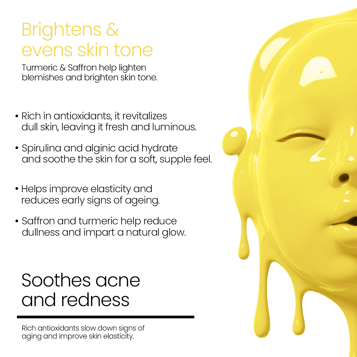 Natural Ingredients: Harnessing the power of turmeric, saffron, and algae, this mask provides a natural and gentle solution for treating skin imperfections, without harsh chemicals or synthetic additives.